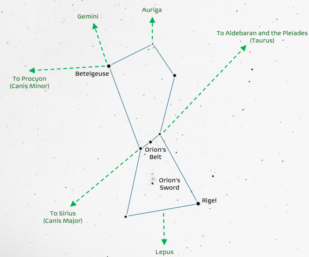 The stars of Orion form a very memorable pattern in the sky. You can use the pattern to point towards other bright stars in neighbouring constellations.