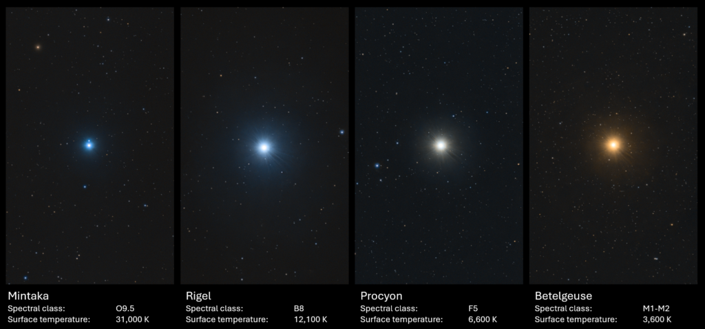 Winter skies are especially striking because many of the brightest stars show distinct colours. This is not an effect of Earth’s atmosphere or light pollution — the colours are real.